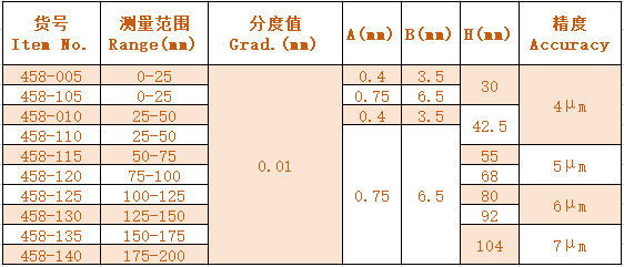 1.用于測量狹窄縫隙,花鍵軸,鍵槽等不易測量位置的尺寸 For measuring narrow slot,spline,groove,etc.in hard-to-reach locations. 2.硬質(zhì)合金或高速鋼量面 Carbide or high speed steel measuring faces.